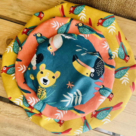 Charlottes en coton imprimé certifié oeko-tex doublé de tissu imperméable 100% recyclé certifié pour le contact alimentaire oeko-tex classe 1, alternative durable idéale pour remplacer le film étirable ou aluminium et en finir avec les déchets toxiques.